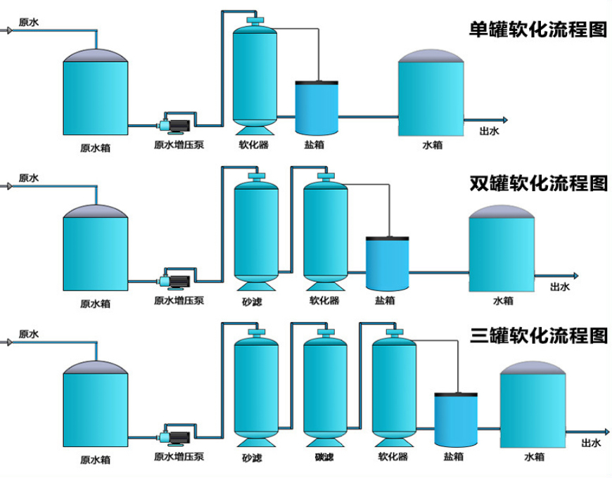 雙閥雙罐系統即兩個樹脂罐兩個多路閥、兩個鹽箱,一個樹脂罐系再生時,另一個工作,實現24小時不間斷連續運行。